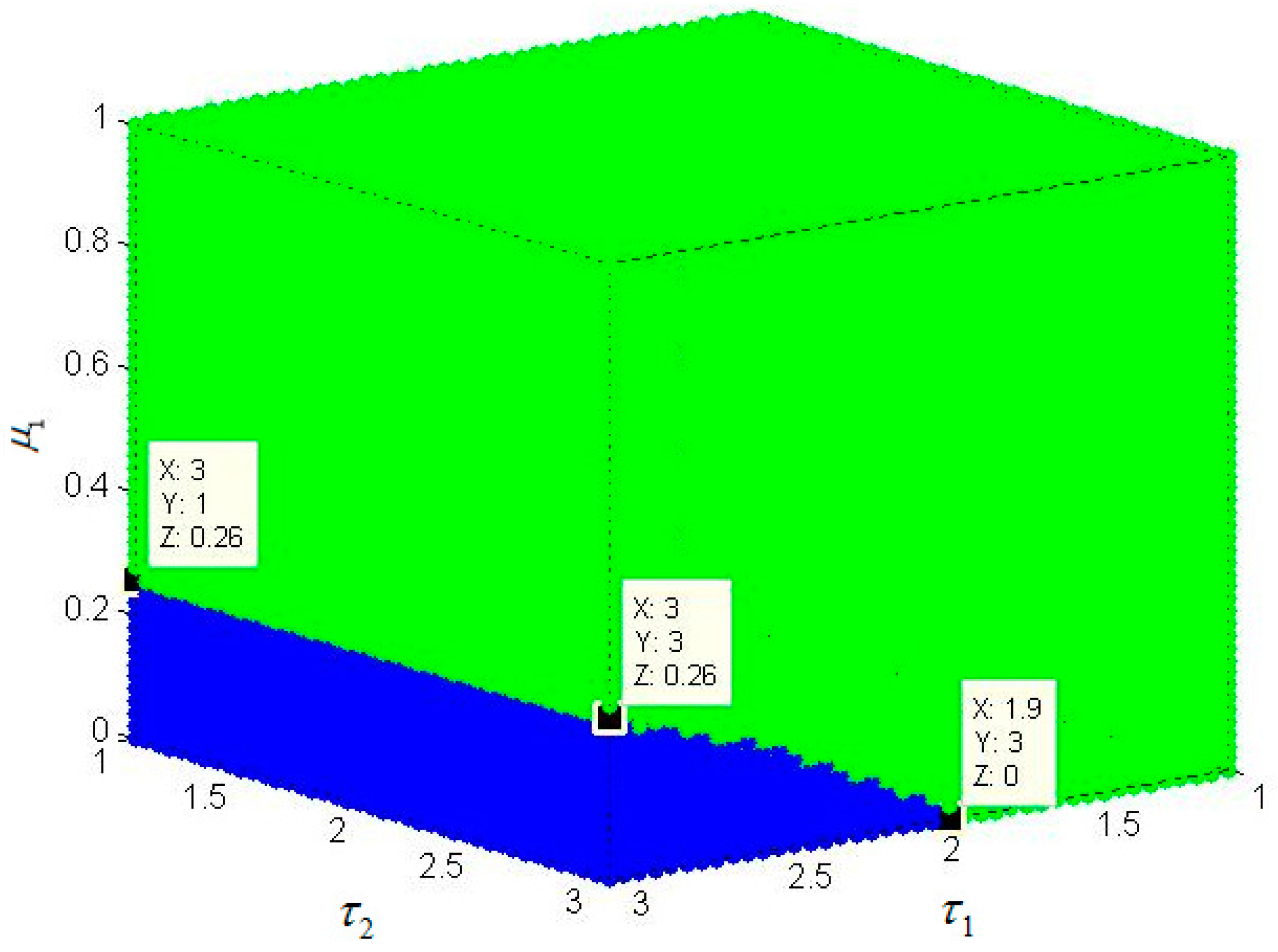 This part focuses on the influence of , and on the stability of . It can be seen from Figure 12 that the changes in and have a greater impact on the stability of , while has little effect on . With the increase of , the system becomes unstable, and the system will be changed from an instable state to a stable state with the increase of . That is, when (, , ) is in the green region of Figure 13, the system is stable; when (, , ) is in the blue region of Figure 13, the system is not stable, and even in a state of chaos. Therefore, when the hydropower enterprises are making power output decisions, they must ensure the combination of parameter values is in the green area in Figure 13.