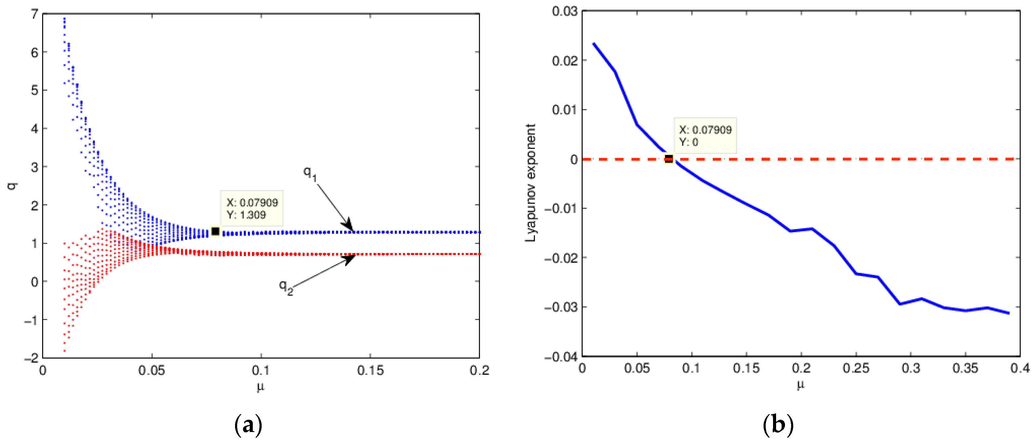 The influence of on the stability of Equation (26). (a) Bifurcation diagram; (b) the Largest Lyapunov exponent.