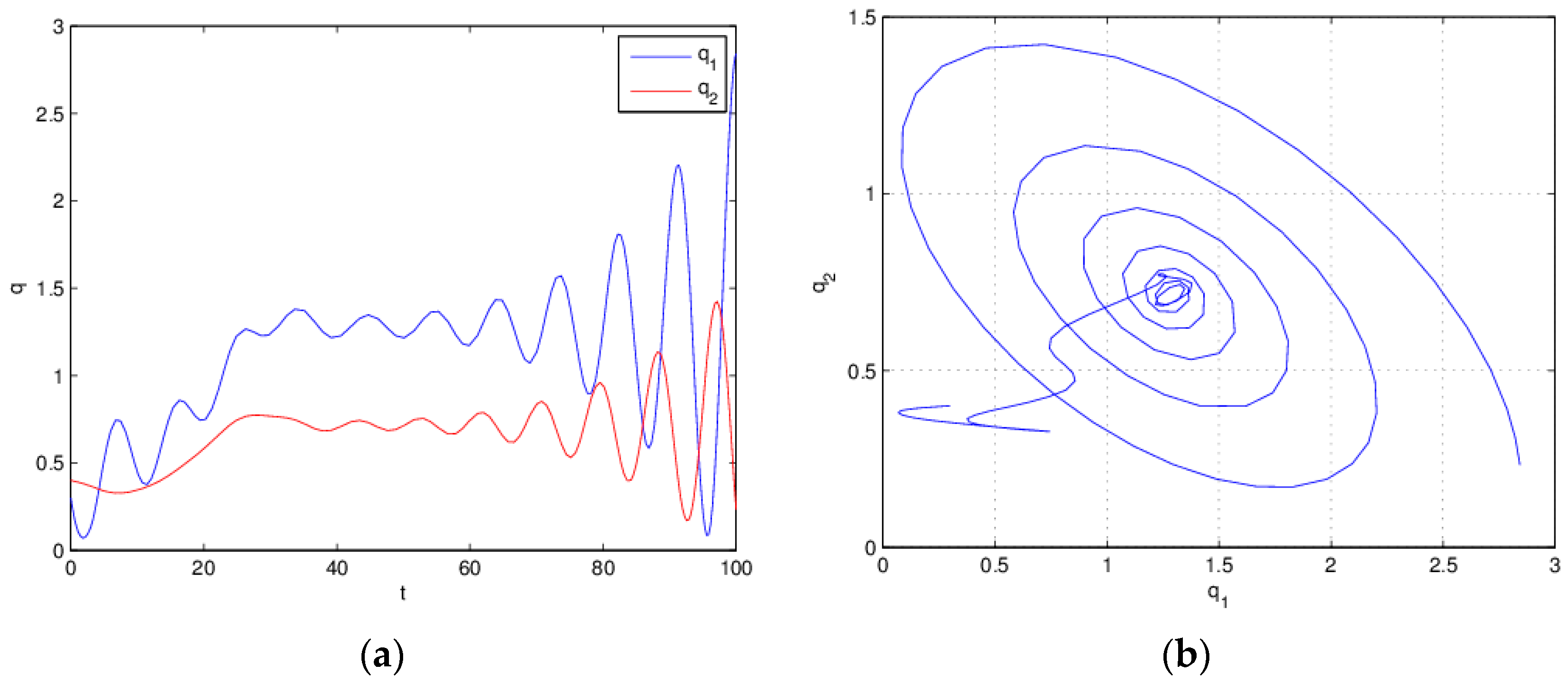 Equation (26) is instable when for . (a) Time series plot; (b) attractor.