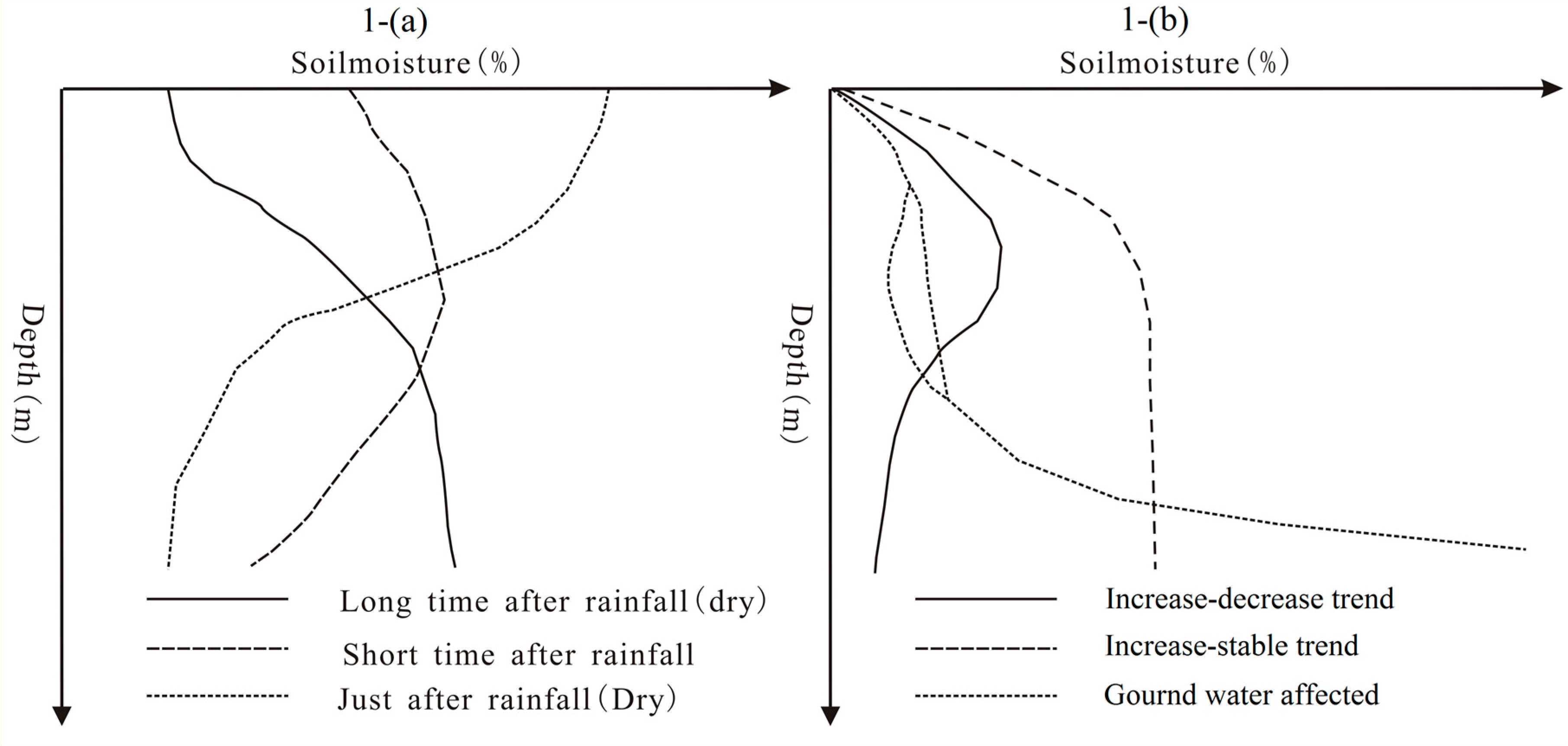 Illustration of moisture distributions in vadose zone (a) soil moisture profiles in shallow vadose zone [10]; (b) soil moisture profiles in deep vadose zone of Badain Jaran Desert [12].