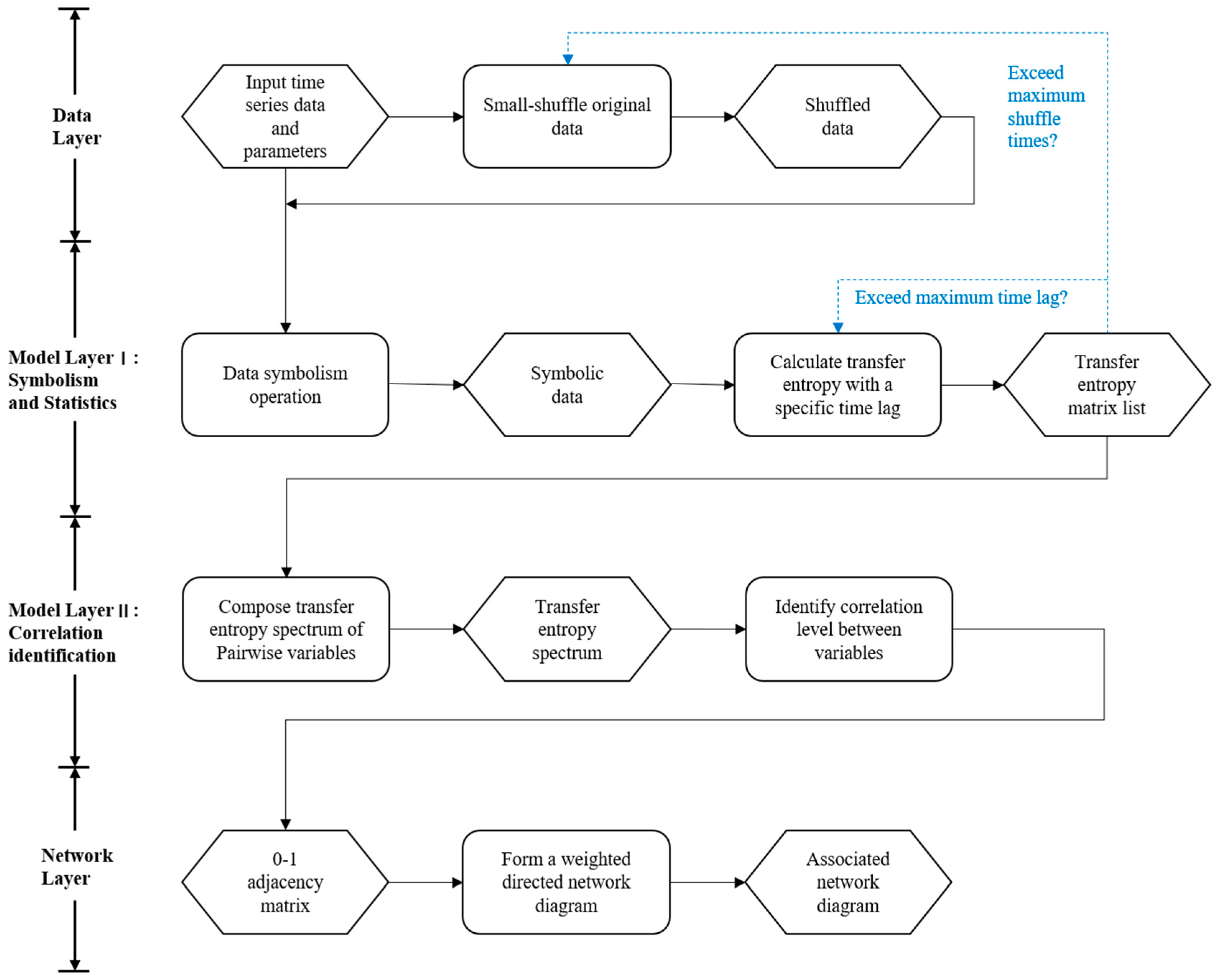 Transfer entropy-based framework to infer association networks from multivariate time series. The black solid arrowed line in the flow diagram represents the determined sequential process and the blue dashed arrowed line, along with a Boolean condition, represents potential process. When the value of condition expression is false, the corresponding process will be carried out. Each rounded rectangle represents a key processing operations using a specific method and each hexagon represents a staged result.