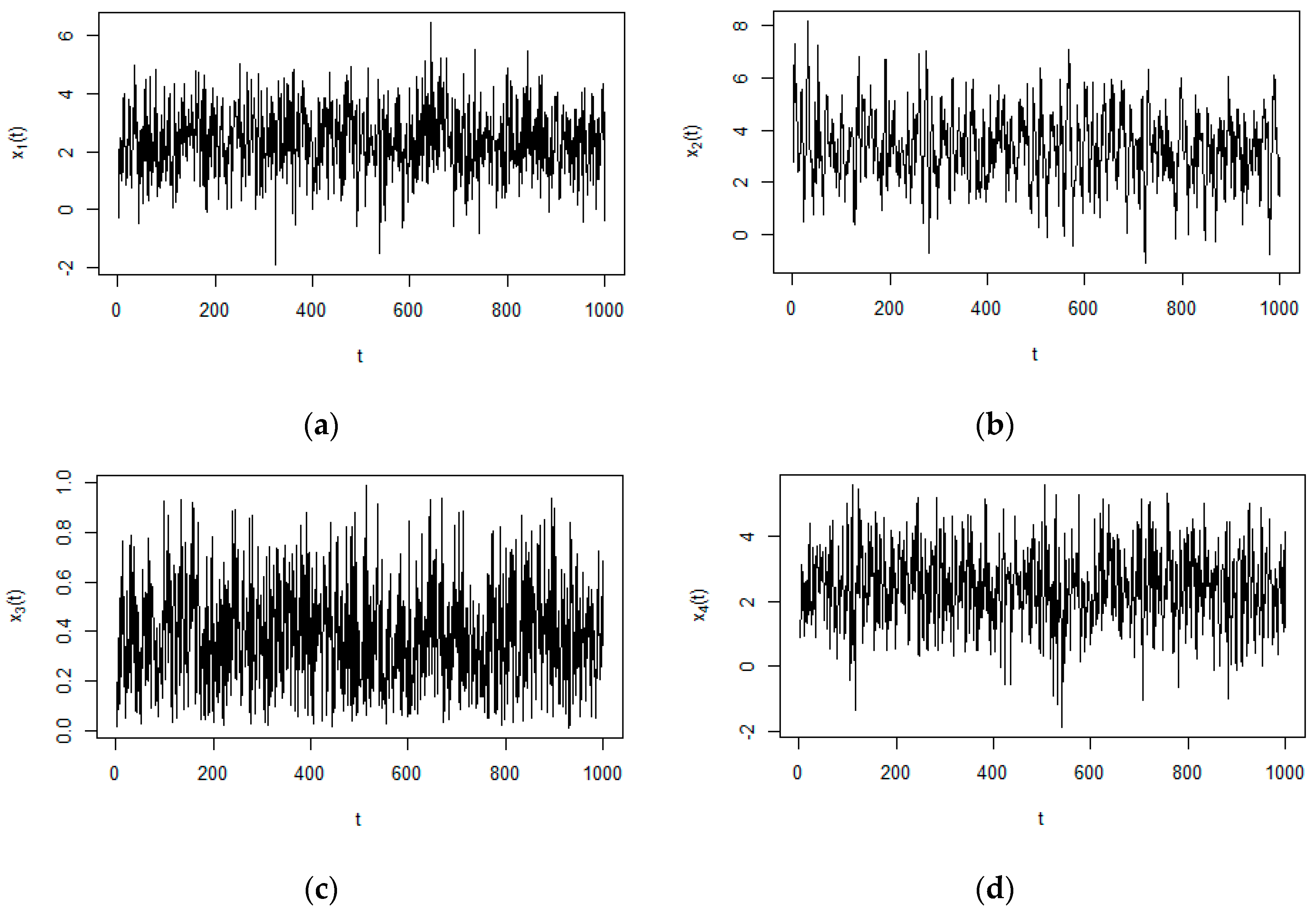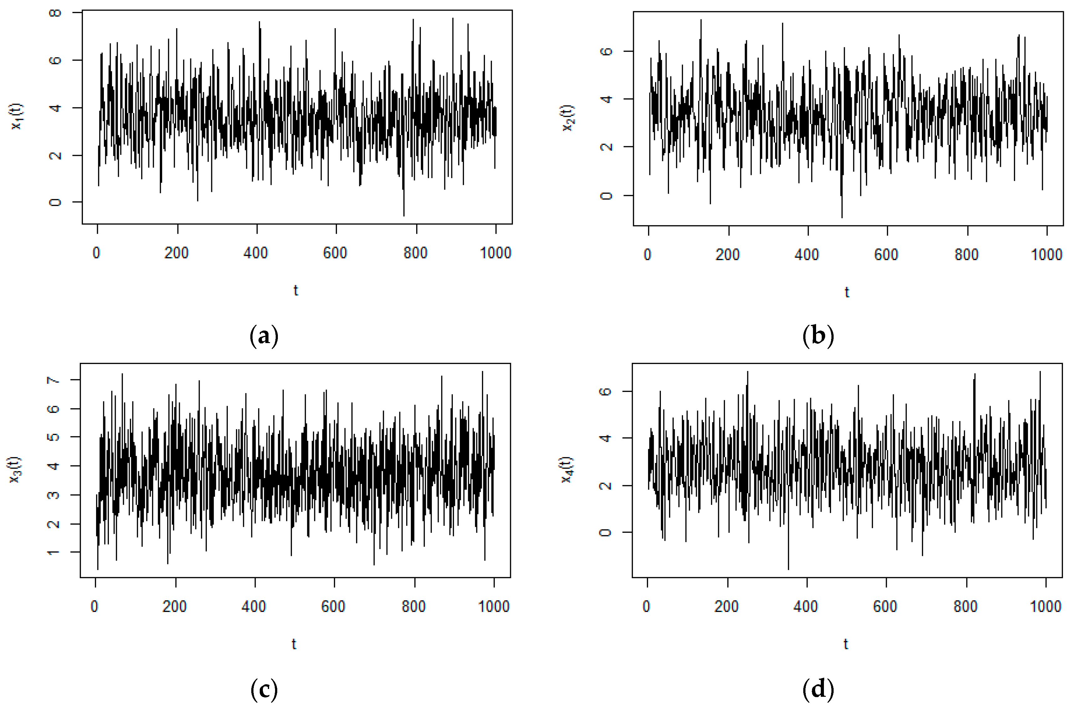 Nonlinear multivariate time series generated by Equations (17)–(20). (a) Time series of ; (b) Time series of ; (c) Time series of ; (d) Time series of .