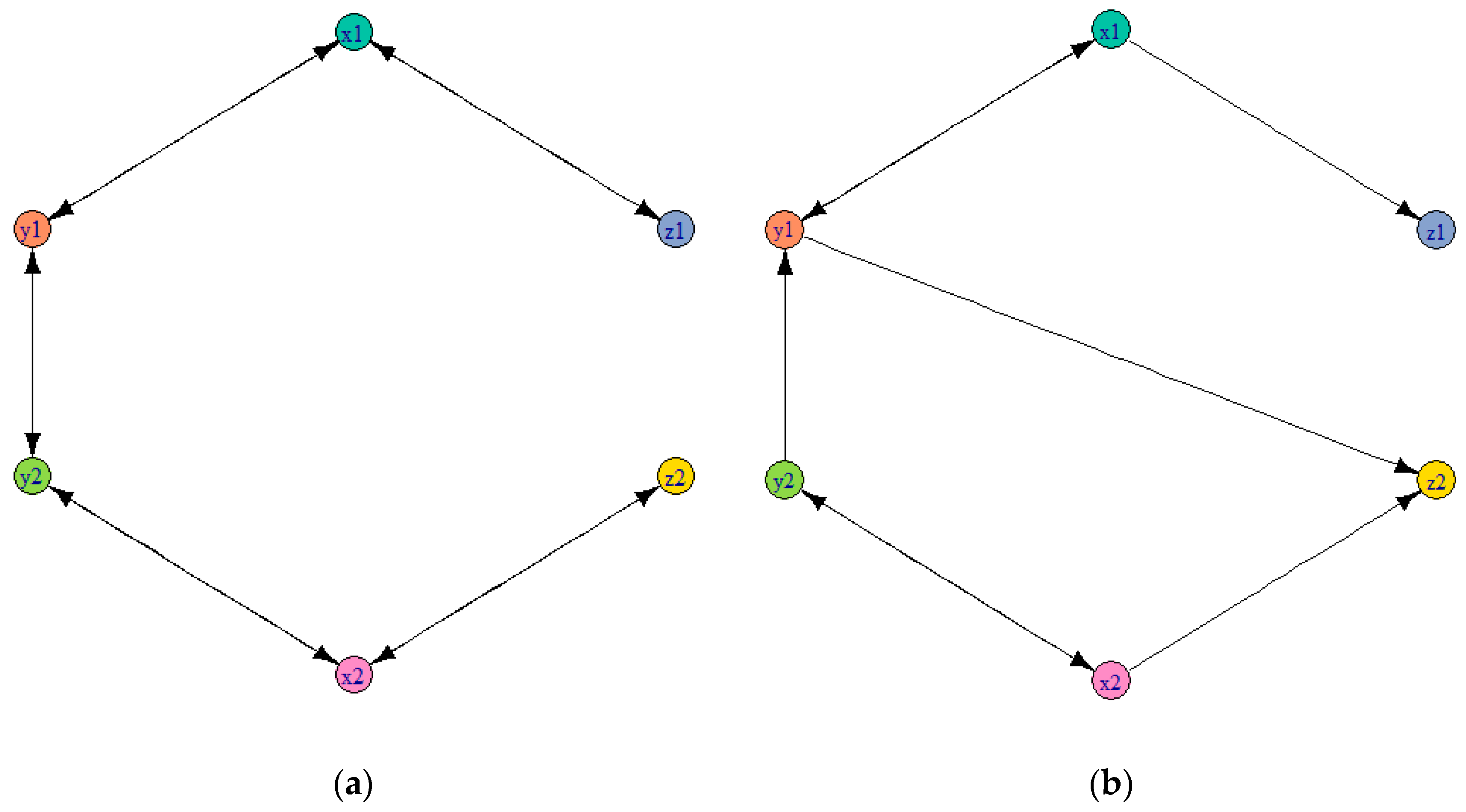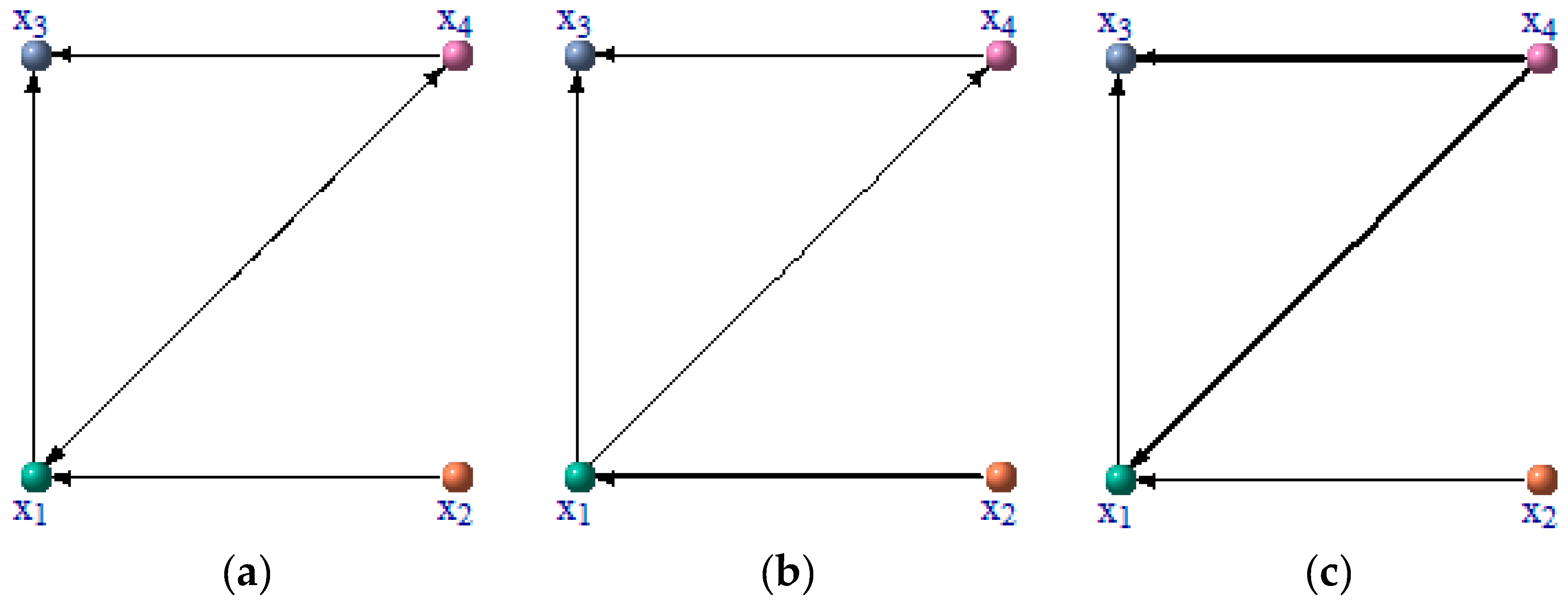 As shown in Figure 3a, variable is driven by two other variables , variable is driven by variables and is driven by . However, is not driven by any other variables and it is only a driven variable of . It is noted that there are autocorrelations in Equations (8)–(11) but we do not show the autocorrelations in Figure 3a. In this paper, we focus on the relationships among different variables but are not concerned with the autocorrelations.