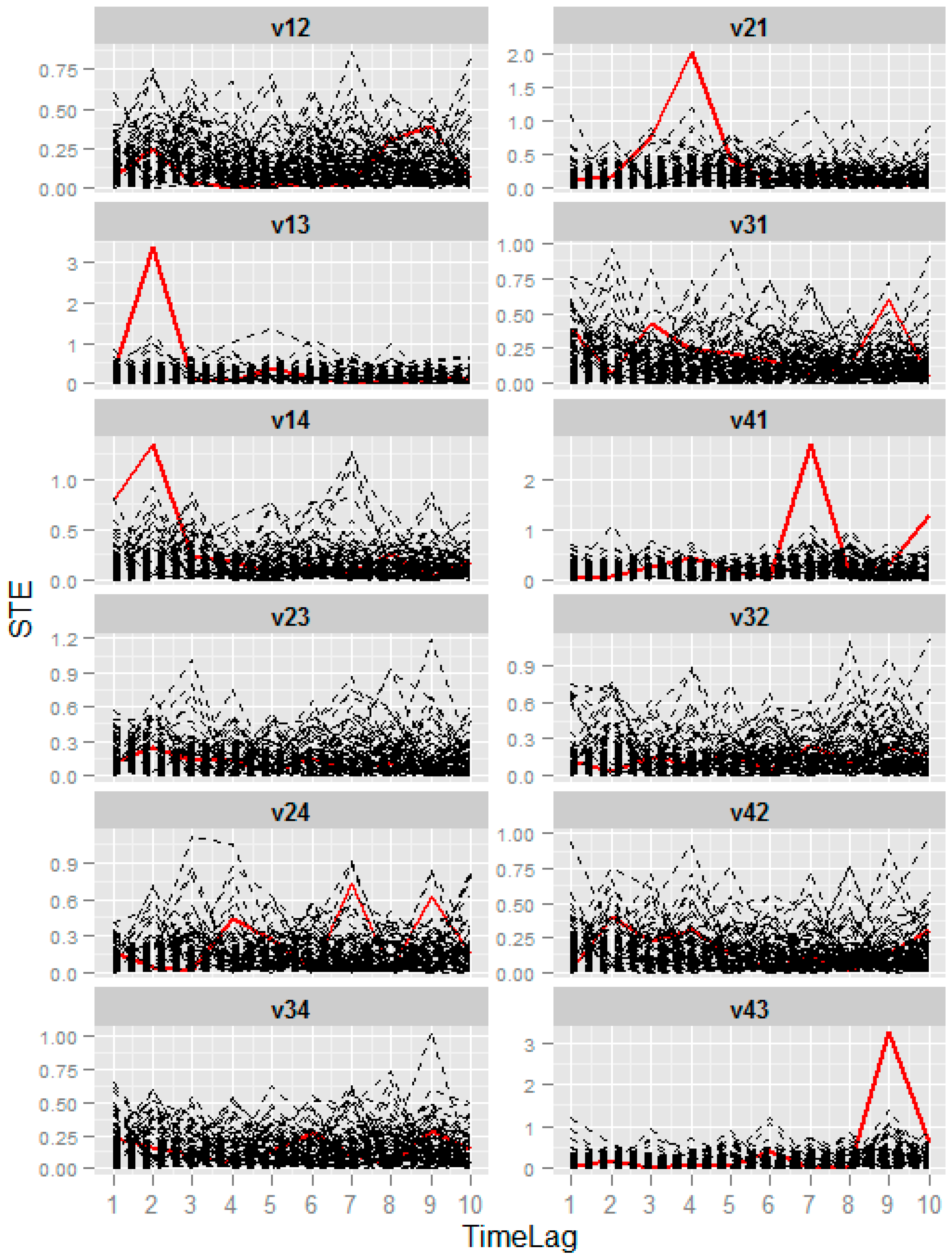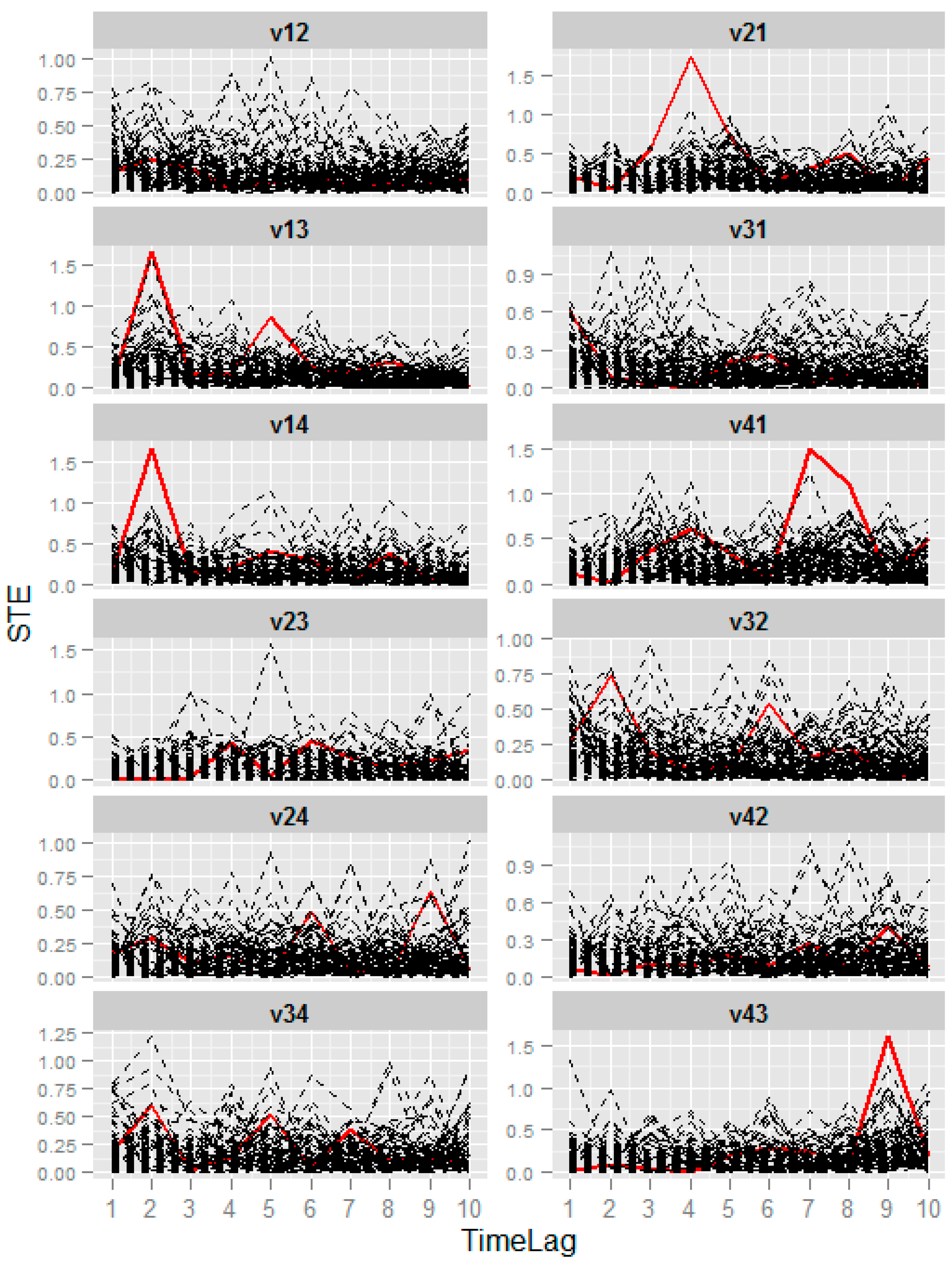 Symbolic transfer entropy spectra of a nonlinear system. Plot v12 is the symbolic transfer entropy spectrums between time series 1 and 2. Plots v21, v13, v31, v14, v41, v23, v32, v24, v42, v34, v43 are the symbolic transfer entropy spectrums between other time series pairs, respectively.