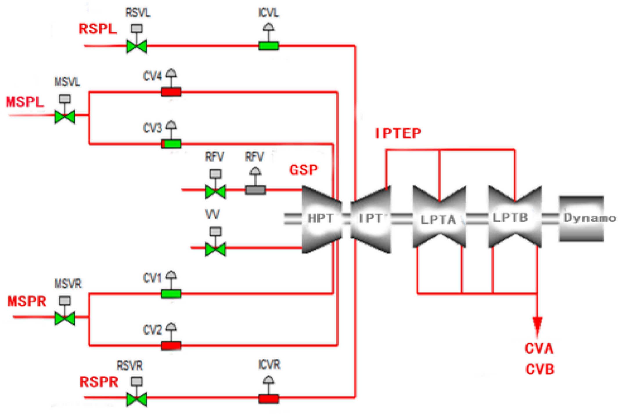 The work principle of stream turbine system. MSPL, MSPR, GSP, RSPL, RSPR, IPTEP, CVA, CVB are the monitored parameters for analysis.