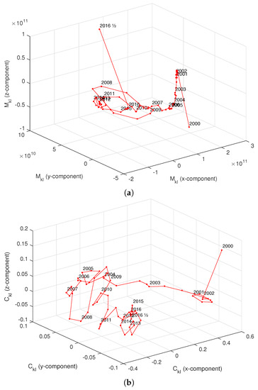 Analysis of the EMU evolution during the years 2000–2016 using the Manhattan distance (), Canberra distance () and Jensen–Shannon divergence (). Comparison between: (a) two states at time and ; (b) two consecutive states at time t and .