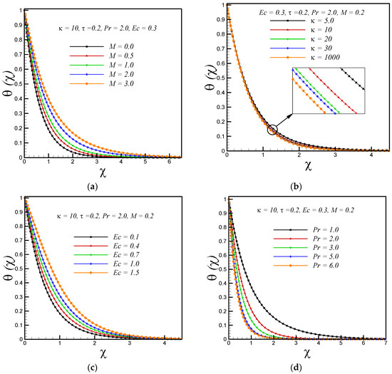 Impacts on temperature profile θ(χ)with variations in (a) magnetic parameter M (b) curvature parameter (c) Eckert number Ec (d) Prandtl number Pr and (e) variable thermal conductivity parameter .