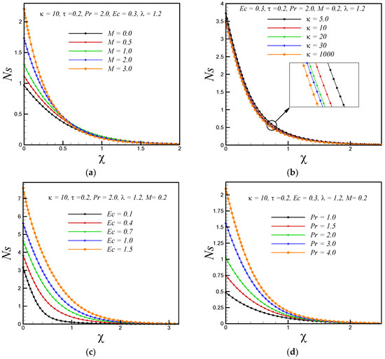 Figure 2a,b represent the effects of magnetic and curvature parameter on velocity profile g’(χ) respectively. It is observed that motion of fluid decelerates with increasing strength of applied magnetic field. This is because a resistive force knows as Lorentz force enhances with increasing strength of applied magnetic field. It is also observed that velocity decreases with rising values of curvature parameter . Further, it is found that for fixed value of the thickness of boundary layer is thick for flow over a curved boundary as compared to flat surface (). The effects of magnetic parameter(M), curvature parameter (κ), Eckert number (Ec), Prandtl number (Pr) and variable thermal conductivity parameter (τ) on temperature profile θ(χ) are shown in Figure 3a–e respectively. It is inferred from Figure 3a,b that temperature rises with increasing values of magnetic and curvature parameter respectively. This is because, the phenomenon of Ohmic heating increases with rising values of and thus leads to rise the fluid temperature. We also observed that for fixed value of similarity variable χ the thickness of thermal boundary layer is thin for the fluid flow past over a flat stretching surface () as compared to flow over a curved stretching surface. The Eckert number Ec is measure of the frictional forces between the fluid layers, therefore, with increasing Eckert number the frictional heating enhances and leads to rise the fluid temperature as presented in Figure 3c. The decreasing behavior of temperature with increasing values of Prandtl number is due to the fact that thermal diffusivity decreases with increasing Prandtl number and consequently leads to drop the fluid temperature as shown in Figure 3d. The thermal conductivity of fluid increase with rising values of variable thermal conductivity parameter (τ), therefore, the temperature of fluid rises with increasing τ as shown in Figure 3e. Figure 4a shows that entropy generation enhances with enhancing the strength of applied magnetic field. This is due to the dissipative nature of the Lorentz force. In addition, it is noticed that the rate of entropy generation is maximum at the curved boundary. Figure 4b illustrates that entropy generation reduce with increasing values of curvature parameter . Further, no significant effects are observed at the surface of curved boundary. In addition, the rate of entropy generation is less in the flow over a flat boundary () as compared to the curved one. Figure 4c,d demonstrate the variations of entropy generation NS with Eckert number Ec and Prandtl number Pr, respectively. We found that entropy enhances with rising values of Ec and Pr. Significant effects are observed at the curved boundary and this is due to the presence of high thermal gradients at the surface of curved boundary. Figure 4e displays that, as the variable thermal conductivity parameter rises, the entropy generation NS enhance slightly at the surface of curved boundary and its vicinity. Furthermore, it is found that entropy generation NS decreases after certain vertical distance from the surface of stretching curved surface. Figure 4f demonstrates that, as temperature difference parameter λ increases, entropy generation NS reduces, therefore, to minimize the entropy generation inside the boundary layer, it is suggested to reduce the operating temperature (increase λ).