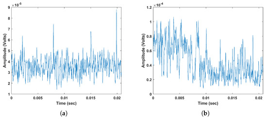 The PAPR, defined in Equation (1), is calculated for each time signal and compared against a threshold of 15 dB. The choice of this threshold is based on evaluation of the whole experiment using different thresholds in the range of [10–20 dB] with a step of one. The main reasons of selecting this range of PAPR are under the assumption of the following. The discharge impulses such as PD have a much higher peak amplitude than noise amplitude. Therefore, a high PAPR indicates that the signal contains little noise. The common noise found in EMI measurement is similar to the one observed in telecommunication system, which typically has a PAPR that varies between [10–20 dB] [18].