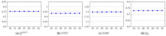 The parameter that is important in the computation of superpixels is k (Section 3.1), the desired number of approximately equally-sized superpixels. For an image with N pixels, the size of each superpixel is approximately pixels. In this experiment, we analyzed the impact of the number of superpixels on the performance of the proposed algorithm. We computed the fusion results with the proposed method using different values of k, and the results were evaluated using all 12 objective fusion quality metrics to get a general indicator. In particular, we tested the performance with , . From the results shown in Figure 10, one can note that most metrics show negligible or no change in the quality of the fused images; therefore, the impact of k on the fusion performance of our method is negligible. However, using a larger value of k certainly increases the execution time of the method due to the extra computation needed in computing the superpixels and their subsequent steps. The average execution times for different k are reported in Table 5. In our method, was set as the default.
