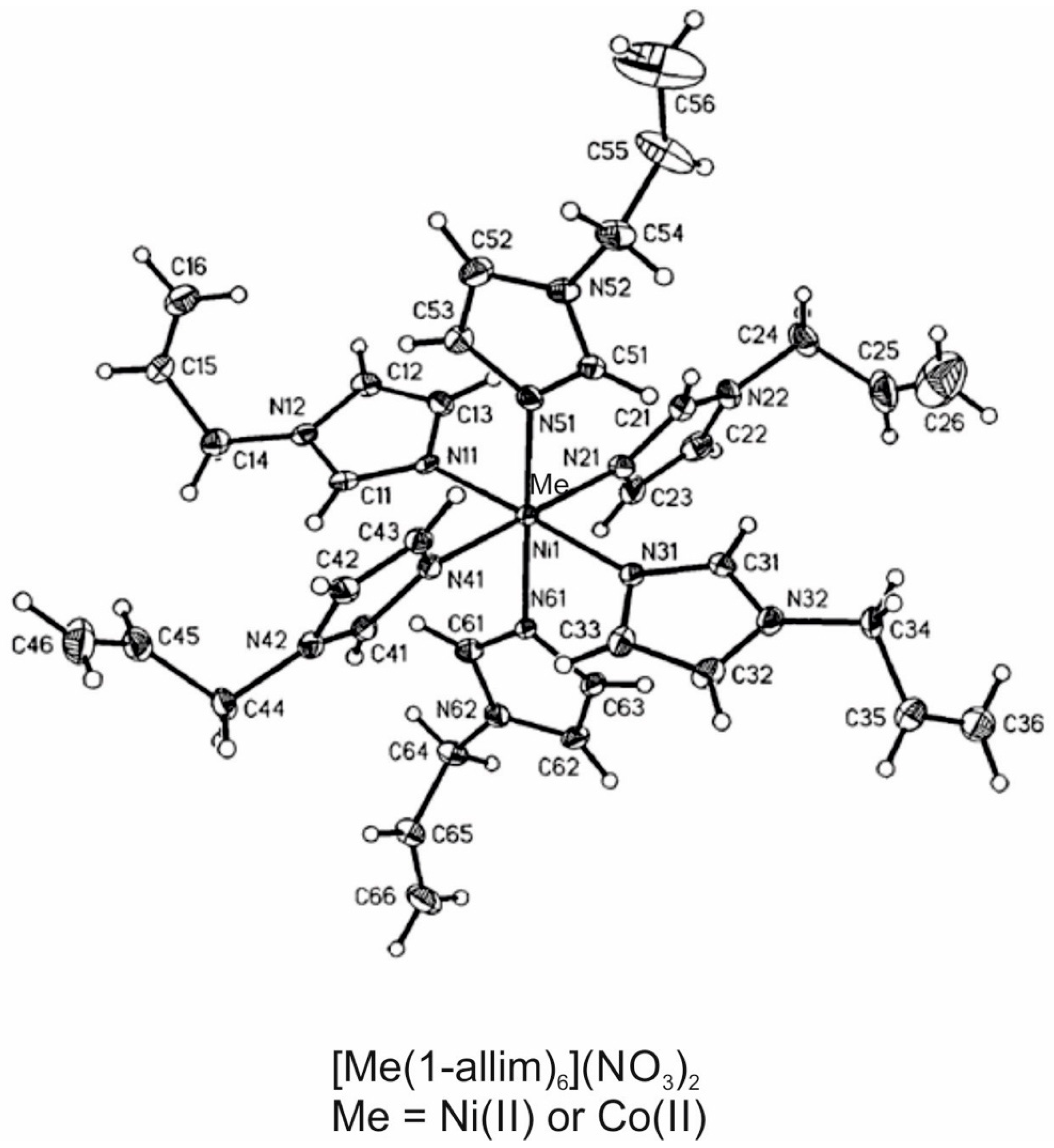- Kurdziel, K.; Glowiak, T. X-ray and spectroscopic characterisation of octahedral cobalt(II) and nickel(II) complexes with 1-allylimidazole in the solid state and electron-donor properties of the latter in aqueous solution. Polyhedron 2000, 19, 2183–2188. [Google Scholar] [CrossRef]