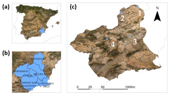 Location of the study area. (a) Autonomous Community of Murcia (Spain). (b) Agricultural regions of Murcia. (c) Study areas in three agricultural regions of Murcia. Numbers refer to the sampling areas. Source base map: Invierno 2020. Gobierno de España y Comunidad Autónoma de Murcia. CC-BY 4.0 scne.es 2020.