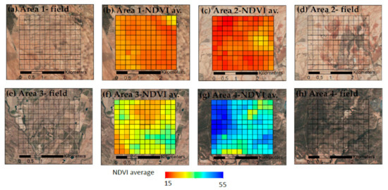 The four study areas, presenting the disposition of each pixel with a satellite image and its average NDVI values for all years: A1, rainfed croplands (a,b); A2, rainfed croplands+scrublands (c,d); A3, grassy+forested+crops (e,f); and A4, woodland+crops (g,h). Sources: Esri, DigitalGlobe, GeoEye, i-cubed, USDA FSA, USGS, AEX, Getmapping, Aerogrid, IGN, IGP, swisstopo, and the GIS User Community.