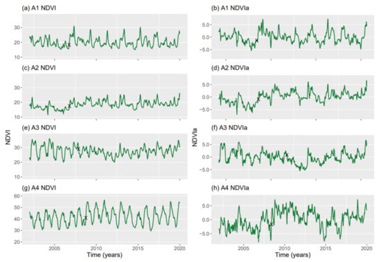 The HI (Table 2), ranging between 0.91 (NDVIa) and 0.68 (NDVI), indicated a persistent character for the NDVI and NDVIa series in the study areas. However, some differences were found between the original NDVI and the NDVIa. The most significant changes between the HIs of the NDVI and NDVIa were found in A4, where persistence increased by roughly 0.2 when the NDVIa was used. Meanwhile, smaller increases, between 0.02 and 0.12, were observed in the other areas. Considering the NDVI, A2 was the most persistent (the highest HI), followed by A3, A4, and A1. Nevertheless, when the NDVIa was analyzed, a different order emerged, and A4 appeared as the most persistent. Its more extensive tree cover and woodland nature are less prone to a high variability, showing a higher persistence. On the other hand, the other areas had similar values and maintained the same order as the NDVI (A2, A3, and then A1).