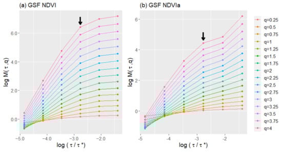 Log–log plot of moments function (M(τ,q)) versus lag time scale (τ) normalized with the maximum lag time scale (τ*) for the generalized structure function (GSF), with q ranging from 0.25 to 4 for the NDVI (a) and NDVIa (b) of A3, grassy+forested+crops. The arrow marks the last point included in the linear regression. All the regressions obtained an R2 ≥ 0.97.