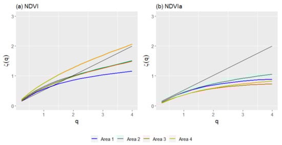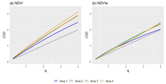 The scaling exponent (ζ(q)) obtained from MF-DFA for the four study areas showed a stronger multifractal character than the GSF results, especially for the NDVIa. For the NDVI, A1 had the most multifractal profile, with A2 and A3 on top and A4 as the least multifractal. This order shifted with the NDVIa, where all areas showed a more multifractal character, while A4 changed from the least to the most multifractal, right below A1 (Figure 9).