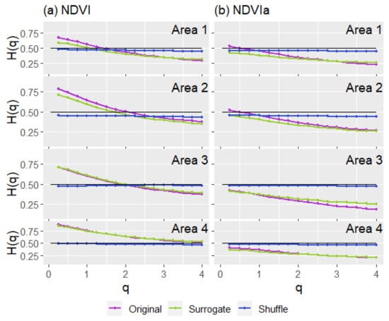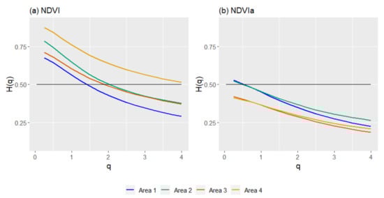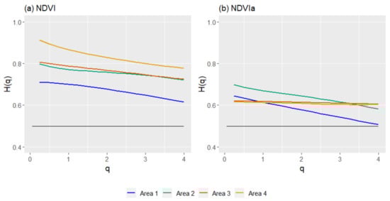 The use of generalized Hurst exponents based on MF-DFA resulted in lower values in all study areas. When NDVI series were used, only Area A4 showed persistence, while A2 and A3 revealed no or little long-term correlation and A1 exhibited an antipersistent character. The decrease in generalized Hurst exponents values was exacerbated when the NDVIa was used, with values suggesting a robust antipersistent character for all study areas.