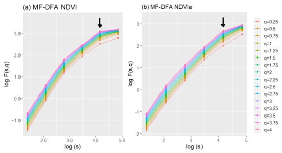 Log–log plots of fluctuation function (F(s,q)) versus time scale (s), for multifractal detrended fluctuation analysis (MF-DFA), with q ranging from 0.25 to 4 for the NDVI (a) and NDVIa (b) for A2 (rainfed croplands+scrublands). The arrows mark the last points included in the regression lines. All the regressions obtained an R2 ≥ 0.97.