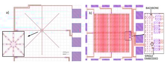 Several experiments have been performed in which evidence of boson distribution gradients in planar arrays, with specific topological structures, has been provided [,,,]. In these experiments the distribution of bosons on the islands was probed measuring current-voltage characteristics of series arrays of the Josephson junctions originated by oxide barriers between the superconductive islands; the junctions were also providing the coupling potential. The main strategy of these experiments relied on comparisons between series array embedded in the graph network being considered, and “sentinel” arrays, namely geometrically identical arrays, being placed on the same chip and having the same geometry and current density of the embedded structure, as shown in Figure 1a for a “star” graph. This position of the problem allows discriminating effects that are solely due to the specific embedding topology. In the present paper we report on results obtained on arrays of star geometry and arrays of double comb geometry. The CAD design of our double comb structures is shown in Figure 1b; here we also show a magnification of the portion of lateral finger where a single junction of a finger array can be contacted. Both arrays of double comb geometry [,,] and arrays of star geometry [] have been subject to both theoretical and experimental investigations.