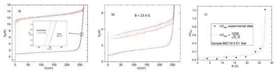 Figure 2c shows what happens when the magnetic field is increased and the height of the Josephson currents becomes closer to the value for which the zero-bias Josephson energy equals kBT which, for a temperature of 4 K, is equal to 175 nA. Indeed, for the value of the field B = 27 G the Josephson junctions of the reference attain a critical current IC lower than 200 nA. At this point, all the junctions of star array (not only those current-biased) can participate to give rise to the theoretically predicted macroscopic quantum state [] and the carrier flow through specific rays of the star can increase as a consequence. We must note that this is not in contradiction with the fact that gap enhancement is observed over all of the junctions of the arrays since the Josephson current is related to the gap through the Ambegaokar–Baratoff equation [,], based on Bardeen–Cooper–Schrieffer (BCS) theory; we also remark, however, that the observed Josephson current increases can be substantially higher than what one would expect from the corresponding gap increases, based on the BCS prediction.
