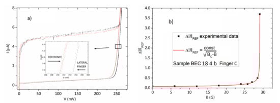 In Figure 4b, we show the fitting of the dependence on the external magnetic field of the difference between the average Josephson currents of the central finger array and its reference array. Even in this case we see that, when decreasing the Josephson coupling, the difference between embedded and reference structures increases and a “phase-transition” functional dependence fits very well with the experimental data.