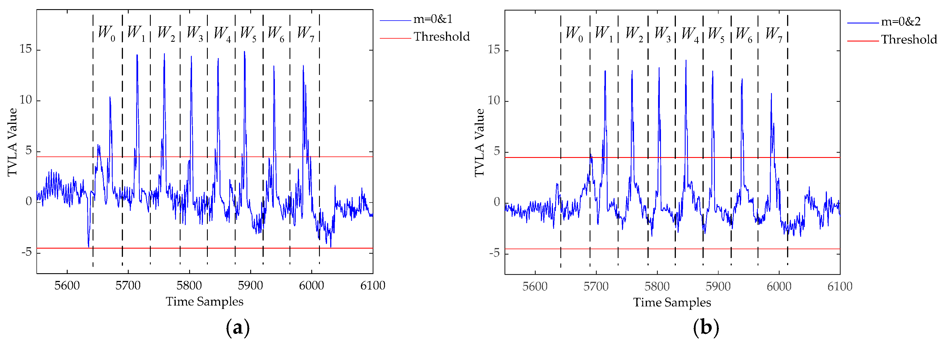 - Identify the PoIs of the measurement sets. Use Equation (1) to calculate the TVLA between the two measurement sets. If the absolute value of the calculated TVLA is greater than the threshold Thsel, then there is a considerable discrepancy between the two measurement sets at this point, which may have leakage.