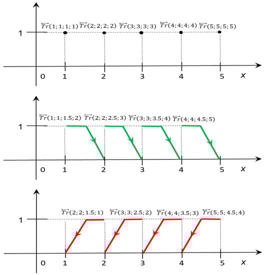 Let us note that the scale can be extended in different ways. For instance, we can introduce an additional level of values meaning “above”, and described by the symbol . The linguistic term means “better than and worse that”. The numerical representation of the phrase “above” is denoted by the . The expression is equivalent to numerical diagnosis . We can transform numerical diagnoses into performance ratings described by TrOFN in the following way: