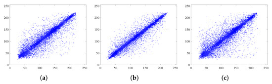 As observed in Figure 1a–c and Figure 2a, the attractor structures of the 2D-CHM, 2D-SM, IHM, and 2D-ICHM are different. The attractor of 2D-ICHM is a noiselike pattern. It indicates that 2D-ICHM has better ergodicity. As can be seen from Figure 1d–f and Figure 2b,c, the bifurcation diagrams of the x and y components of the 2D-ICHM are also noiselike patterns, where the control parameters and . It indicates that 2D-ICHM has a larger parameter space and continuous chaotic range. Taken together, 2D-ICHM has a more complex chaotic behavior and is suitable for image encryption systems.