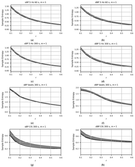 Plots showing sample entropy (SampEn) values calculated using m = 1, 2, 3, 4 and 5, from various time-domain (5 Hz, 60 s and 300 s; (a–d)), beat-domain (e,f), and cardiac interval series (CIS; (g,h)) systolic blood pressure (sBP) and diastolic blood pressure (dBP) data, across a range of r values.