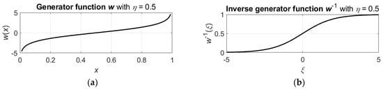 It is easy to show [] that the inverse functions and have the same properties as probability distributions and, in general, can be defined by any positive sigmoid functions with the values in the interval . Then, generator functions and are the inverses of the corresponding sigmoid functions and can be considered as quantile functions.