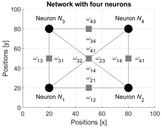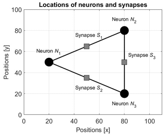 In the network with mobile neurons, the weights are applied for two goals. The first is a conventional use for specification of the output of the neuron (see Equations (15) and (16)), and the second is a definition of the value of the potential function in the location of the synapse. The second use is possible since in the considered approach the network is implemented in the form of physical devices with definite locations on a plane. Namely, if the neurons and are associated with the mobile robots located in the points and , then it is assumed that the synapse is located at the geometrical center of the line connecting these points. Figure 3 shows an example of locations of three neurons , , and and three synapses , , and connecting these neurons.