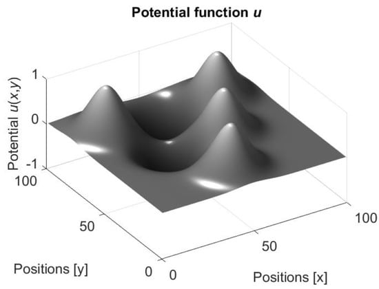 In the definition of the potential function, the neurons and, consequently, the robots are considered as obstacles and the potential function in their locations obtains the highest value . In the other points of the plane the values of the potential function are defined by an appropriate smoothing. The potential function for the neurons and the synapses shown in Figure 3 with the neurons’ states , and and the weights and is shown in Figure 4.