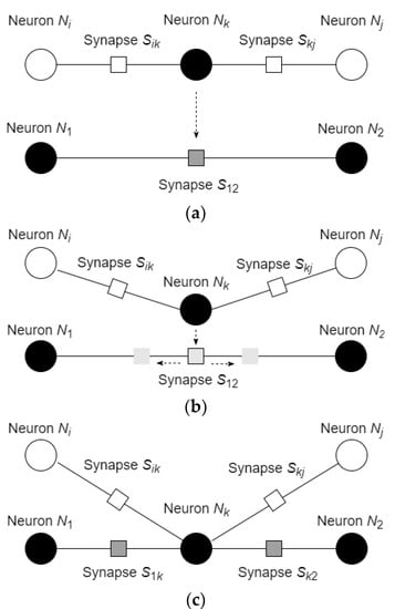 The process of synapse substitution and creation of new synapses: (a) neuron , which is connected with the neurons and via the synapses and , moves toward the synapse , which connects the neurons and ; (b) the synapse is “divided” into two synapses; (c) neuron substitutes synapse in its location and connects with the neurons and via new synapses and .