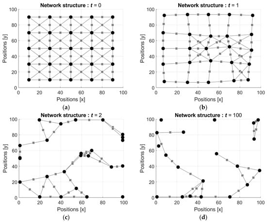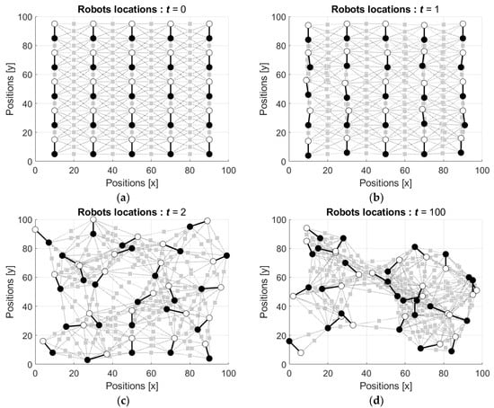 Locations of the robots starting from the position in ordered configuration: (a) initial locations, ; (b) locations after the first movement of each robot, ; (c) locations after the second movement of each robot, ; and (d) locations after the 100th movement of each robot, .