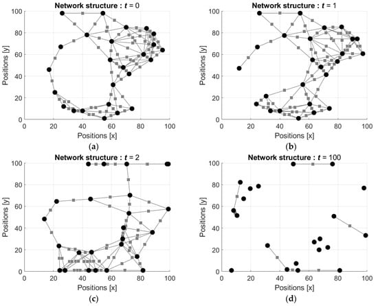 Locations of the robots starting from the position in random configuration: (a) initial locations, ; (b) locations after the first movement of each robot, ; (c) locations after the second movement of each robot, ; and (d) locations after the 100th movement of each robot, .