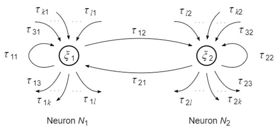 Let us consider the weights of the synapses, which specify the strength of the connection between the neurons. The changes of these values are associated with the learning process. The weights can be defined either externally by a certain training process or internally using the states of the neurons. In the first case, the network converges to definite configuration, which leads to the desired result on the output neurons, while in the second case the network demonstrates certain self-organization [] and can change its configuration with respect to the states of the neurons and of the environment. In the suggested model, we follow the second approach and define the transition possibilities with respect to the states of the interconnecting neurons.
