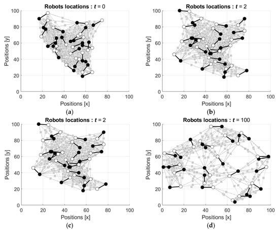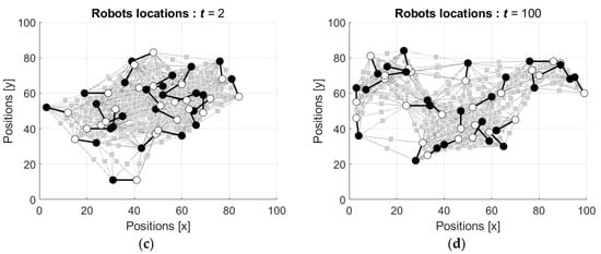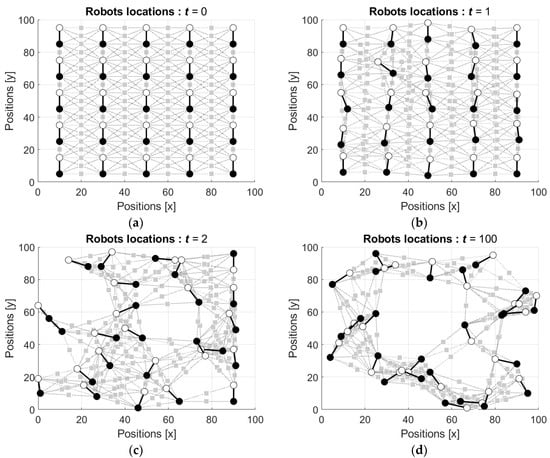 It is seen that the initially dense group of the robots (Figure 13a) diffuses by the first and the second movements of the robots (Figure 13b,c). Figure 13d shows scattered configuration of the robots’ locations after the th movement of each robot.