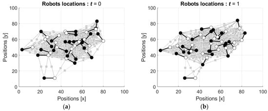 In the first simulations, the states and of the neurons are initialized by random, such that both and are drawn from the interval with respect to uniform distribution and then these values as well as the weights of the connections are updated using Equations (15)–(19). Figure 12 shows the locations of the robots starting from the ordered configuration (the video can be found in Supplementary Materials, Video S3). In this figure and the figures below the neuron is depicted by a white circle and the neuron is depicted by a black circle.