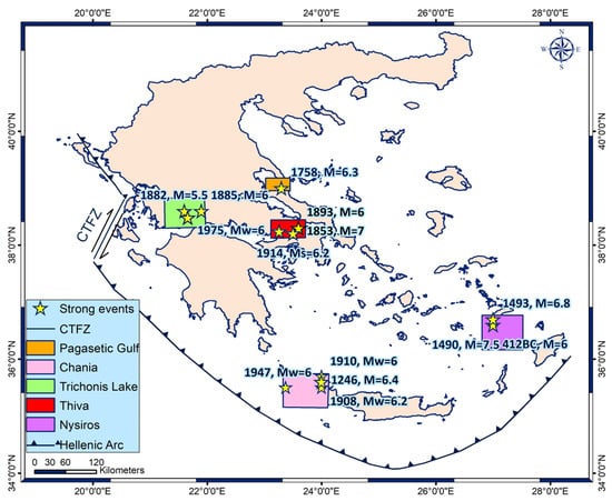 - Ambraseys, N.N.; Jackson, J.A. Seismicity and associated strain of central Greece between 1890 and 1988. Geophys. J. Int. 1990, 101, 663–708. [Google Scholar] [CrossRef]