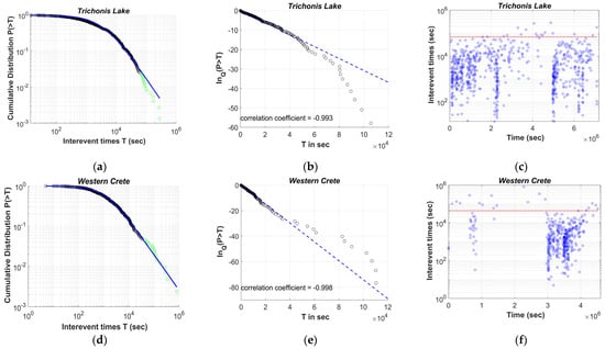 The results of the analysis are presented in Figure 3, in terms of the cumulative distribution P(>T) of the inter-event times T for each earthquake swarm. The Q-exponential fitting uses the generalized expression of entropy, Equation (1) describes the observed distributions quite well, leading to the parameters qT and Tq (Table 2). The transition from NESP (black circles) to Boltzmann–Gibbs (green circles) scaling regimes is indicated by the color change in Figure 3. The corresponding Q-logarithmic distribution lnQ(P(>T)) for each earthquake swarm is shown in the middle panels of Figure 3, while the evolution of inter-event times (T) as a function of time (t) is shown in the right panels of Figure 3. The red dashed line (Tc value) shows that most inter-event times have T values less than Tc, indicating that the Tsallis entropic mechanism is predominant in the main part of the swarm. However, as time passes the characteristics of the earthquake swarm such as those of finite degree of freedom and long-range memory, related to a non-extensive statistical physics description are not any more predominant and the Boltzmann-Gibbs statistical physics is recovered (i.e., q = 1).