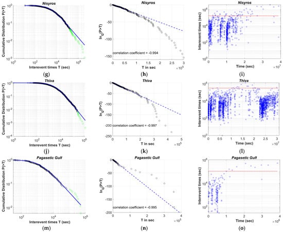 Left panels (a,d,g,j,m) The log-log plot of the inter-event times cumulative distribution for M ≥ Mc, represented by circles. The change of colors indicates the transition from NESP (black circles) to Boltzmann–Gibbs regimes (green circles). The blue solid line represents the Q-exponential distribution fitting, for the values of (a) qT = 1.44, Tq = 1805 s, (d) qT = 1.53, Tq = 633 s, (g) qT = 1.58, Tq = 1625 s, (j) qT = 1.47, Tq = 1736 s, (m) qT = 1.57, Tq = 829 s. Middle panels (b,e,h,k,n) The corresponding semi-q-log plot of the cumulative distribution of the inter-event times (T), represented by circles. The Q-logarithmic distribution exhibits a correlation coefficient (ρ) and the dashed line is the Q-exponential fitting with qT. Right panels (c,f,i,l,o) The evolution of inter-event times (T) with time (t). The deviation from linearity suggests a Tc value, presented in Table 2, which is indicated by the red dashed line and shows the crossover point between NESP and BG statistical physics.