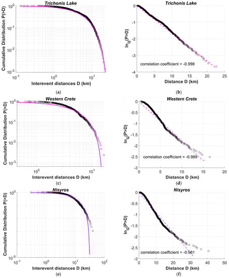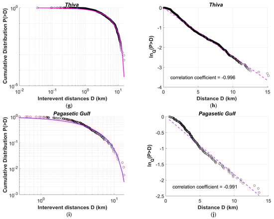 The Q-exponential distributions for the 2007 Trichonis Lake, the 2016 Western Crete and the 2021–2022 Nisyros swarms, describe well the observed scaling behavior for the values of qD = 0.75, Dq = 7.5 km and qD = 0.46, Dq = 8.62 km and qD = 0.48, Dq = 16.67 km, respectively. Furthermore, for the 2021–2022 Thiva and the 2022 Pagasetic Gulf swarms, the Q-exponential distributions describe well the observed P(>D) for the values of qD = 0.67, Dq = 5.47 km and qD = 0.46, Dq = 8.46 km. The interevent distances of the seismic activity deviate from the exponential function, indicating organization rather than random spatial occurrence []. The corresponding Q-logarithmic distributions approximate linearity with high correlation coefficients, indicating the goodness-of-fit between the model and the data. According to our results, the cumulative distribution functions of inter-event times and distances are quite well described with the Q-exponential function, with an entropic parameter q greater than one (q > 1) for inter-event times and less than one (q < 1) for the inter-event distances, further confirming the results of [,,,,].