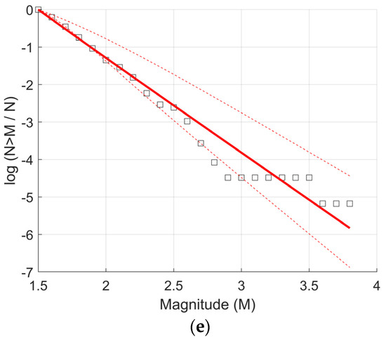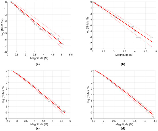 where M represents the earthquake magnitude, N(>M) is the cumulative number of earthquakes with a magnitude equal to or greater than M and a, b are positive scaling parameters. Parameter a describes the regional level of seismicity and shows significant variations from one area to another. Parameter b, also known as the b-value, is the slope of the frequency–magnitude distribution (FMD) and describes the size distribution of the earthquake events. The estimated b-value usually has typical values close to 1 [,,], especially for tectonic earthquakes, but there have been reported high b-values (up to 3) associated with volcano areas [].