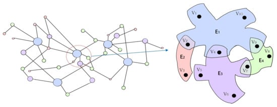 In this study, the hyperdegree is represented as the vector. Take WeChat for example, if user U has 60 friends, two groups of 4, and five groups of 30, then the hyperdegree of U is 67, which can be shown as [60, 0, 2, 0, ⋯, 0, 5]. The number of components of the vector depends on the number of nodes contained by the maximum hyperedge in the hypergraph. Figure 1 shows a simple hypergraph. The largest hyperedge contains 5 nodes and the hyperdegree of is represented by [0, 0, 1, 0].