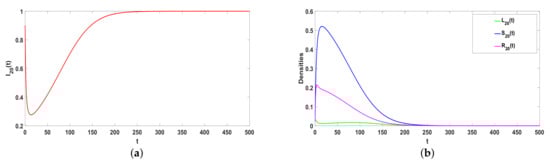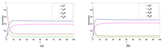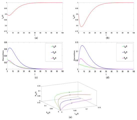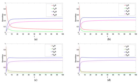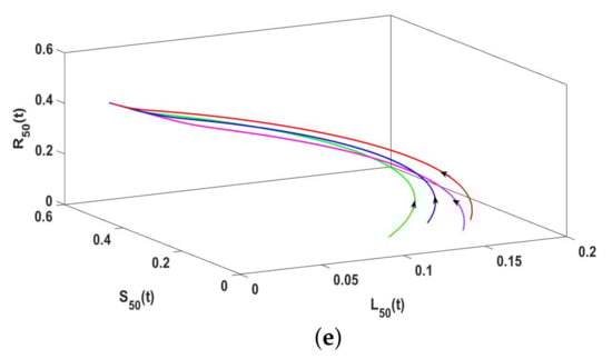 Take , , , , , , , and , respectively, thus . Based on Theorem 1, is locally asymptotically stable, which can be confirmed by Figure 3a–d. In addition, is globally asymptotic stable, which can be shown in Figure 3e. As time goes on, rumors will eventually disappear.