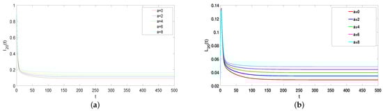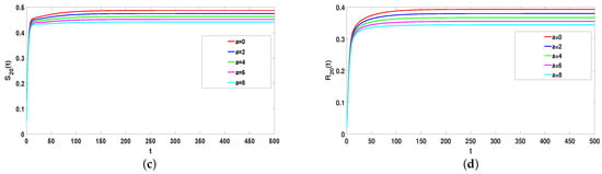 The impact of parameter a in model (1) will be analyzed in the following. Take , , , , , , and . Choose a = 0, 2, 4, 6, and 8. When the system is in equilibrium, Figure 7 shows the value of and increases with increasing a, while the value of and decreases. Thus, the rumor can be reduced by increasing the psychological factor. In real life, the government can intensify science popularization or education to increase the effect of psychological factors.