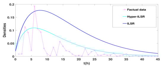 Take , , , , , , , , and . Figure 9 shows that the Hyper-ILSR model goes to 0 faster and fits the real data better than the general ILSR model.