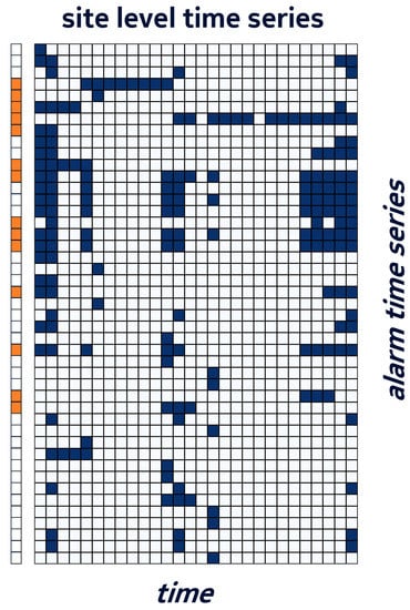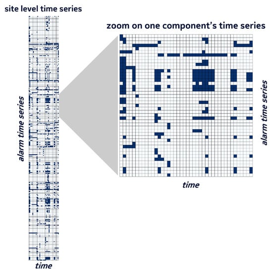 For each alarm  identified by the triplet , we created a binary time series representing the sequence of its daily states. Depending on the prediction layer, the time series were grouped per site or per component. Examples of a time series for a site and a time series for one of its components are shown in Figure 2. The group of component time series, on the right, is a sub-set of the site-level time series on the left.