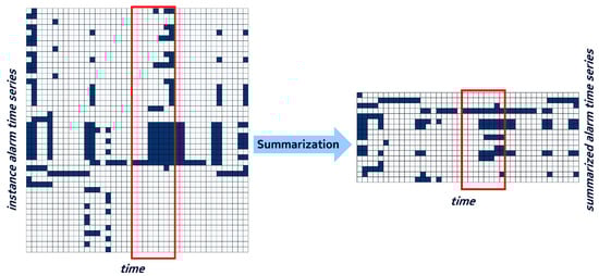 Example of alarm time series before and after summarization. The red boxes delimit an 8-day bundle in their original and summarized forms, respectively.