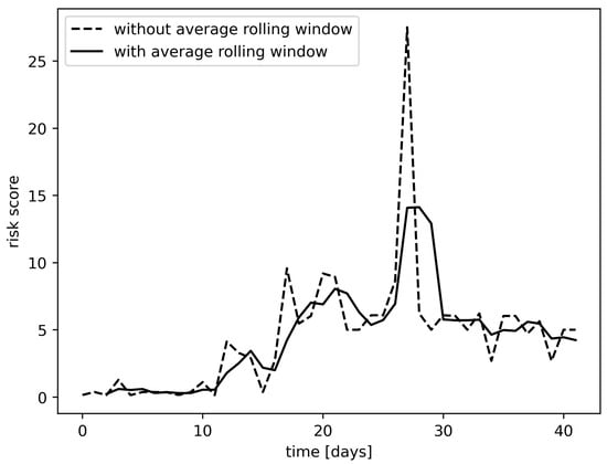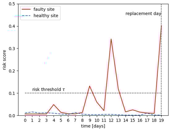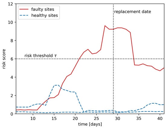 In order to predict whether a site is faulty, we used the RSF method with two modifications: an average rolling window and a risk threshold that will be defined in the following. A random survival forest will predict a risk score for each site for each time-step. For each site, we used an average rolling window (see Figure 6), where the window length w was a hyper-parameter to smooth the risk score for a given period. If the average rolling window went above the risk threshold (see Figure 7), where the risk threshold  was a hyper-parameter, then we classified the site as faulty. Otherwise, we classified it as normal. The space of hyper-parameters () has been explored and evaluated by cross-validation.
